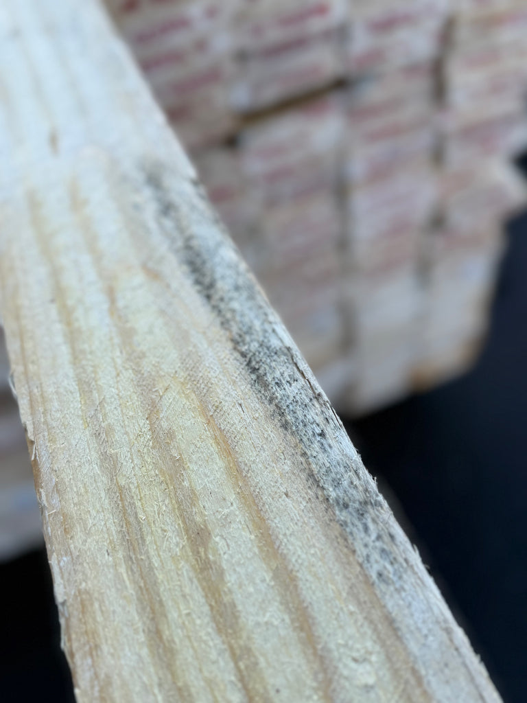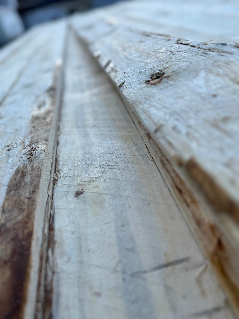 Råsågad grov yta. Förekommer spår av mögel, kvistar och sprickor. Vankant/bark kan förekomma.